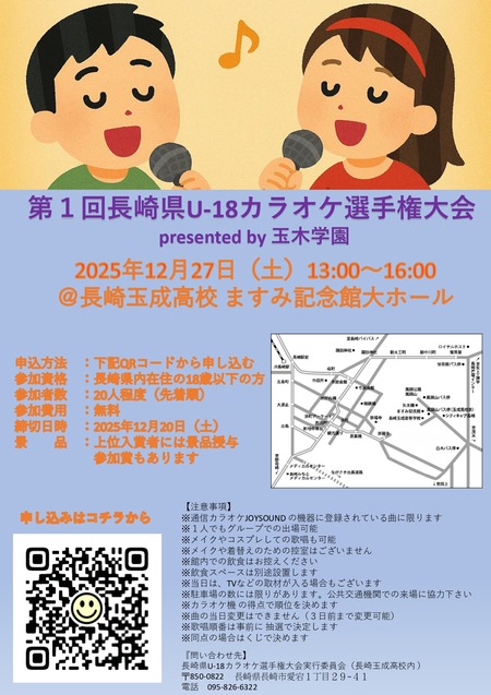 高校deカラオケ大会? 12月27日(土)13時~16時 長崎市風頭 長崎玉成高校にて 「長崎県U‐18カラオケ選手権大会」初開催✨ 参加資格は県内在住の18歳···